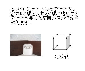 建物自体(人工的な化学物質が含まれたクロスや床などの建材)ならびに、建物内にある人体にとって悪い影響があるモノ(プラスチック製品電化製品・衣類・金属等)の波動を減少させます。